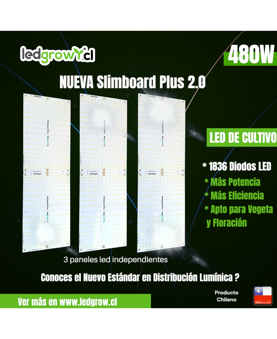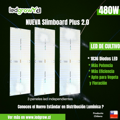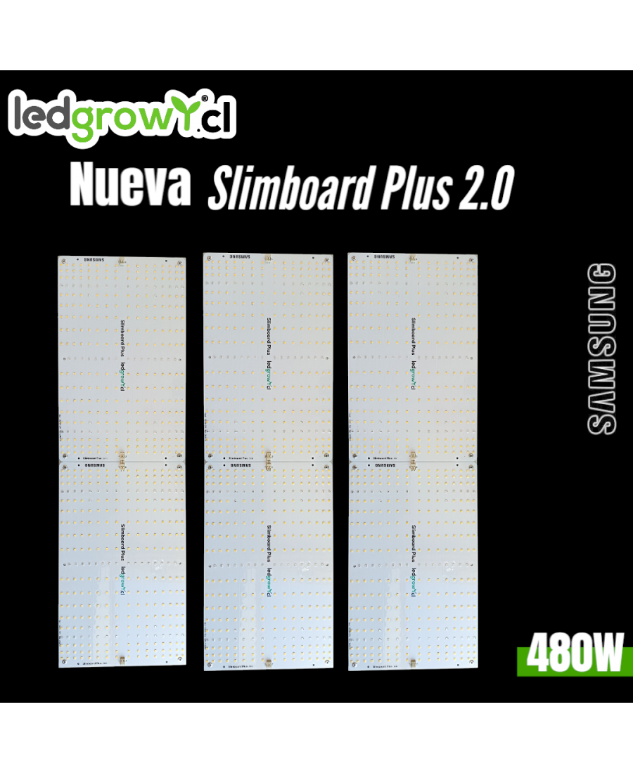 Slimboard Plus V2.0 – 480W. Compacto y eficiente, con más diodos y driver aislado de alta gama. Olvida los paneles baratos que concentran la luz en el centro: aquí cada planta recibe intensidad homogénea.